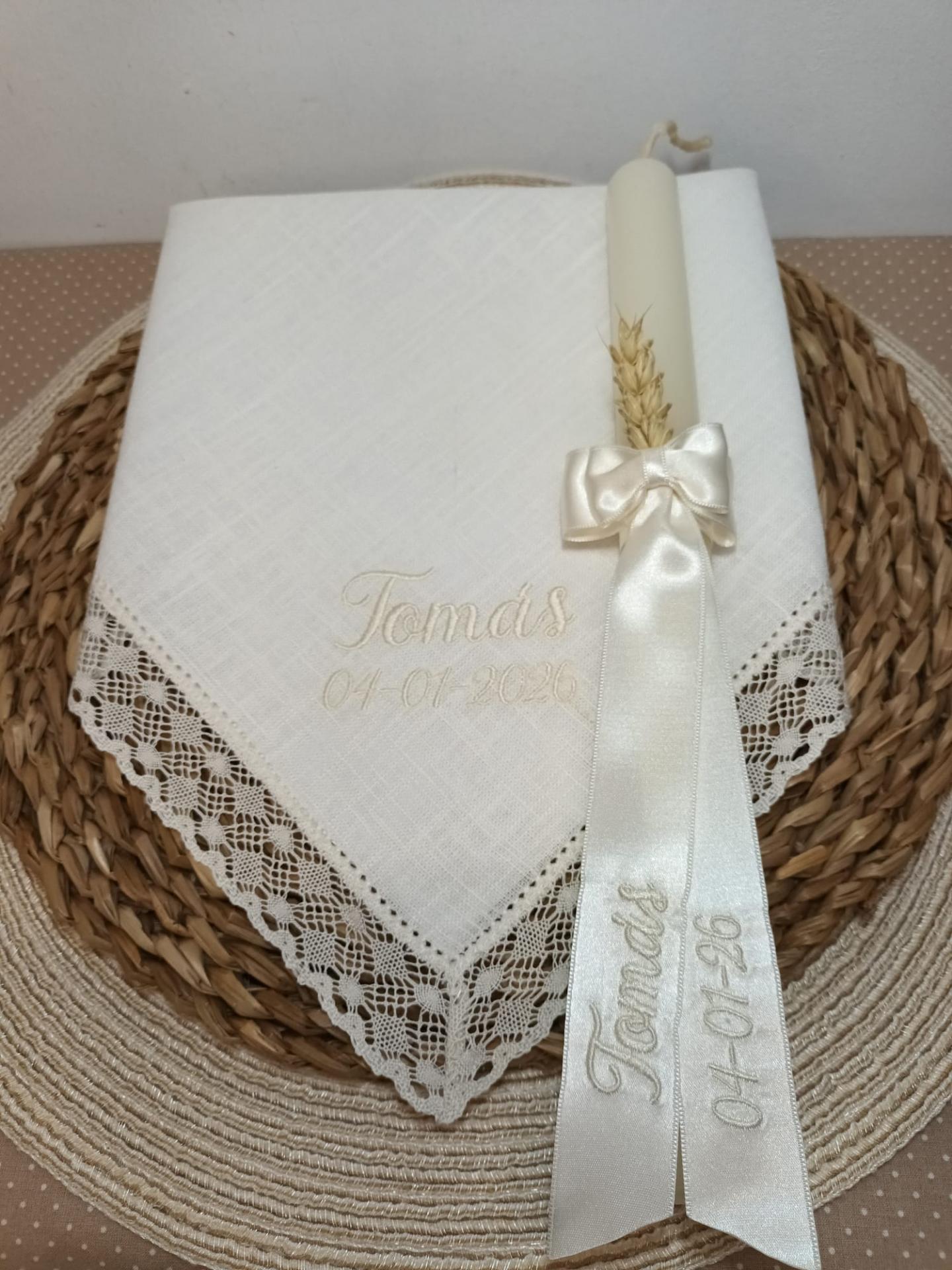 Con lazo de raso bordado el nombre y la fecha del Bautizo en crudo.
