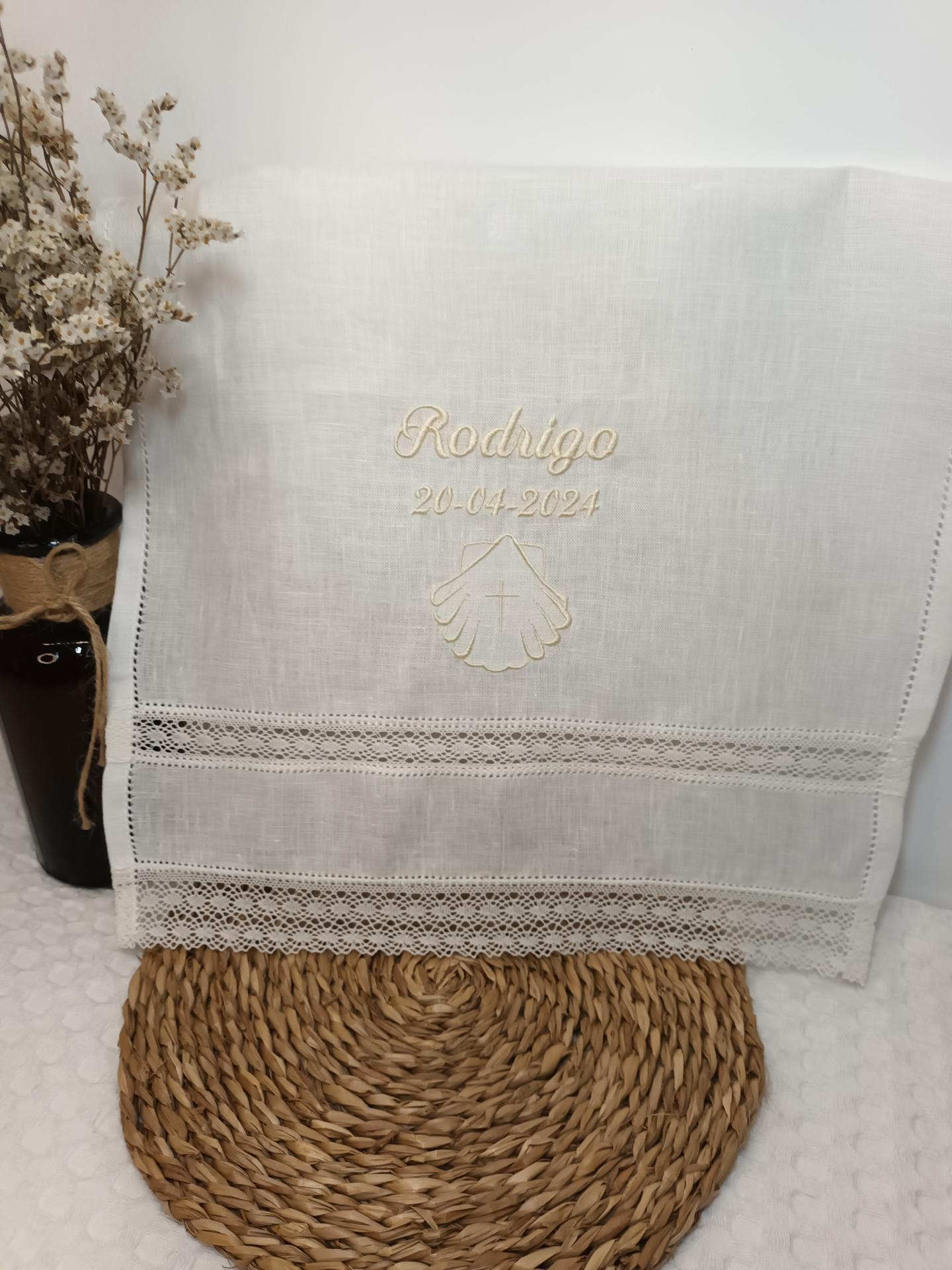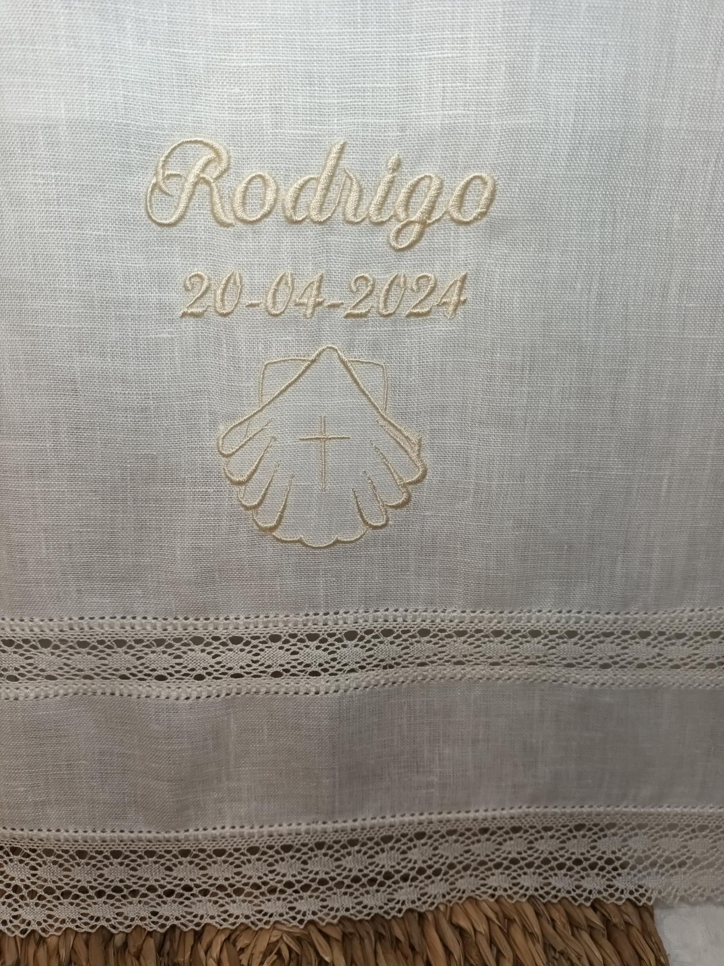 el nombre bordado y la fecha del Bautizo.