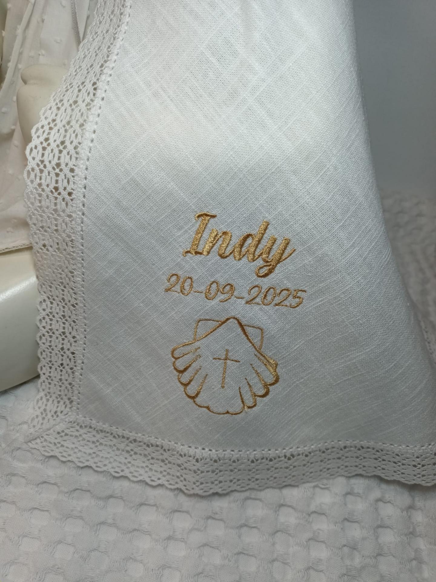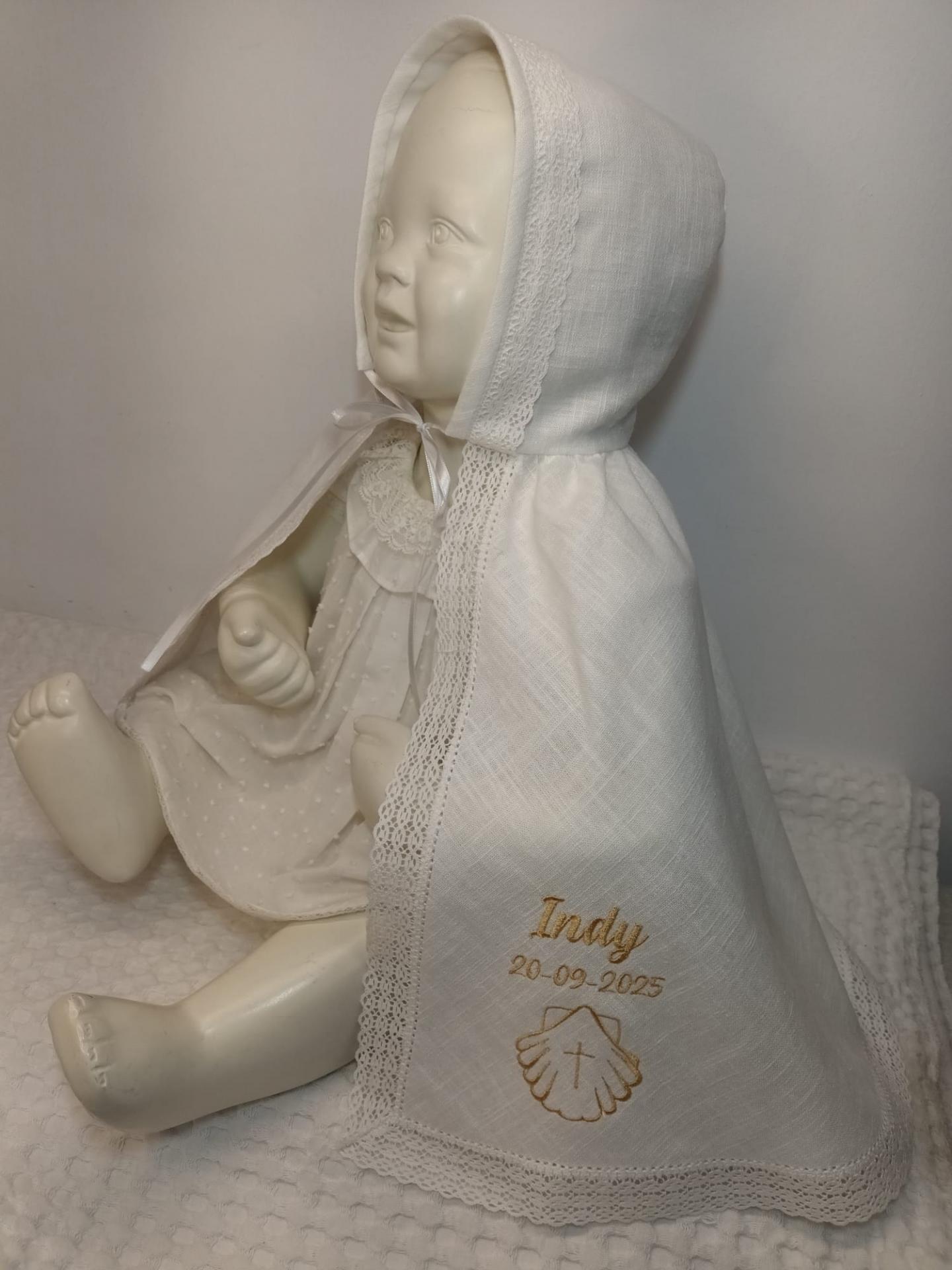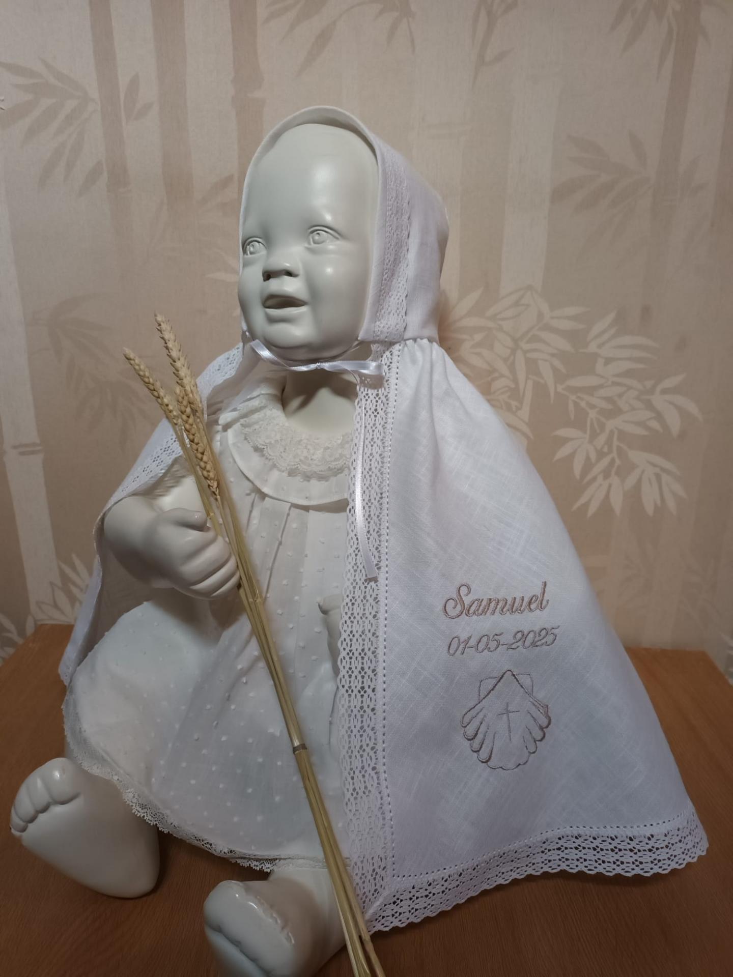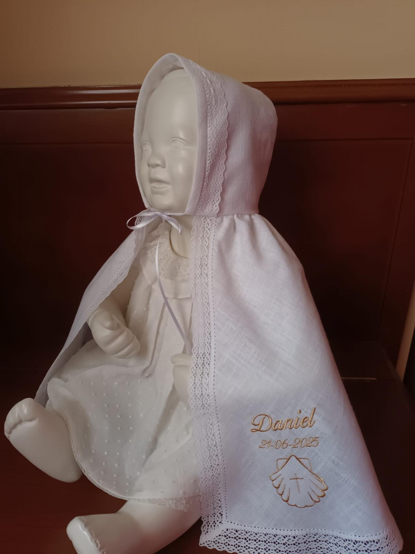 Capa de Bautizo confeccionada con tela de lino blanco .