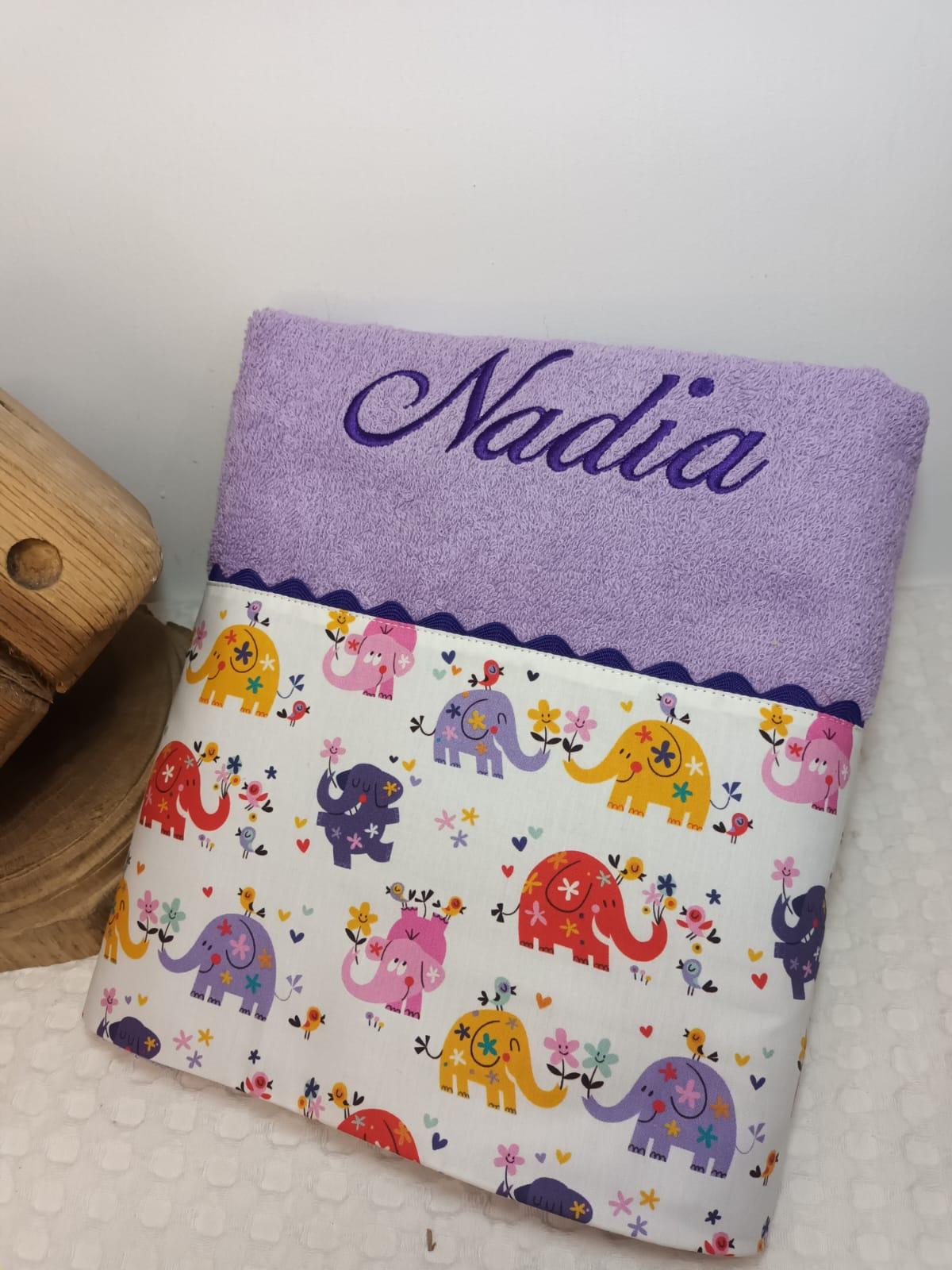 Toalla personaliza con cenefa de tela de Elefantes.