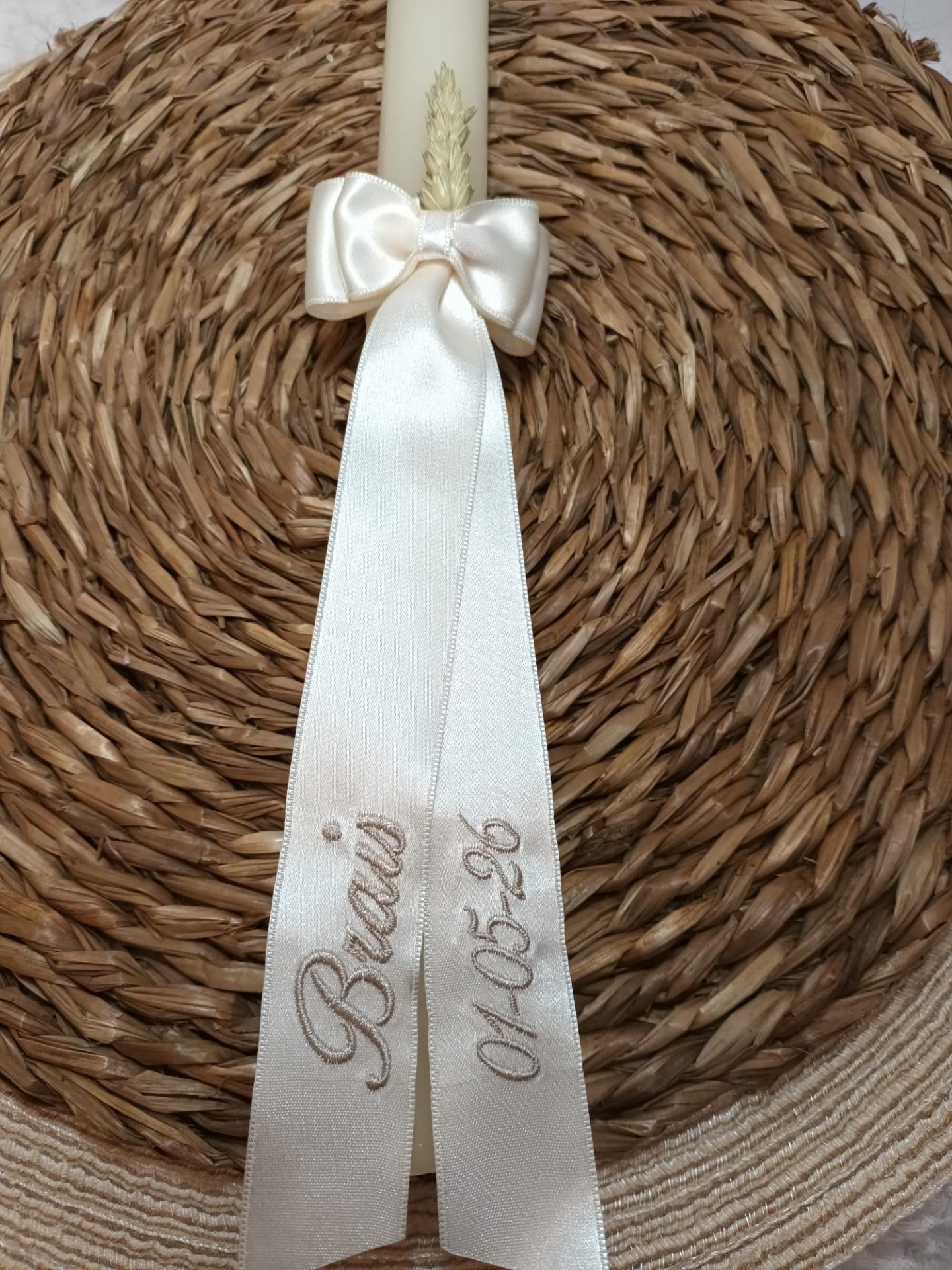 Con lazo de raso, flor de tela y bordado el nombre y la fecha del Bautizo en beis.