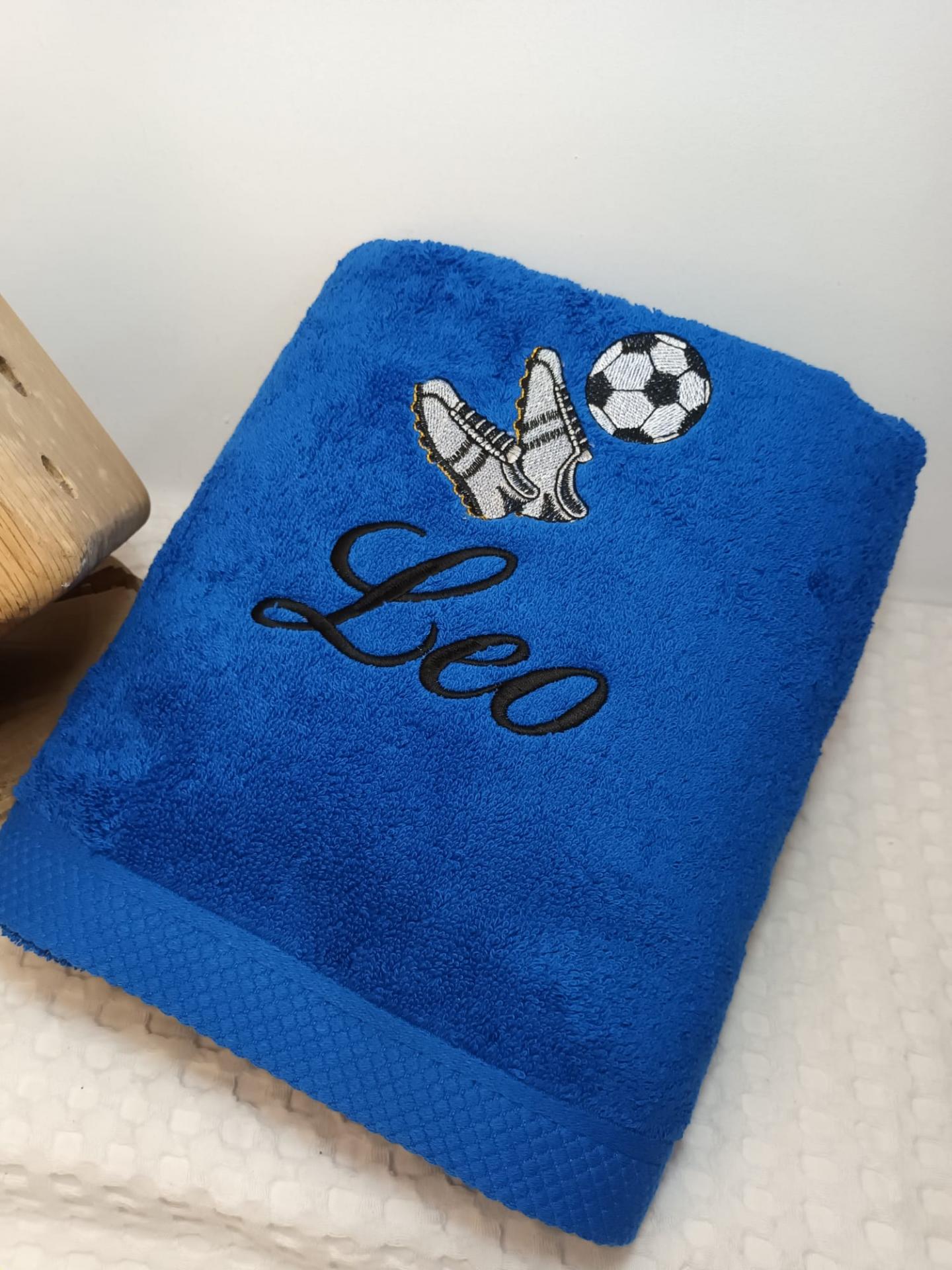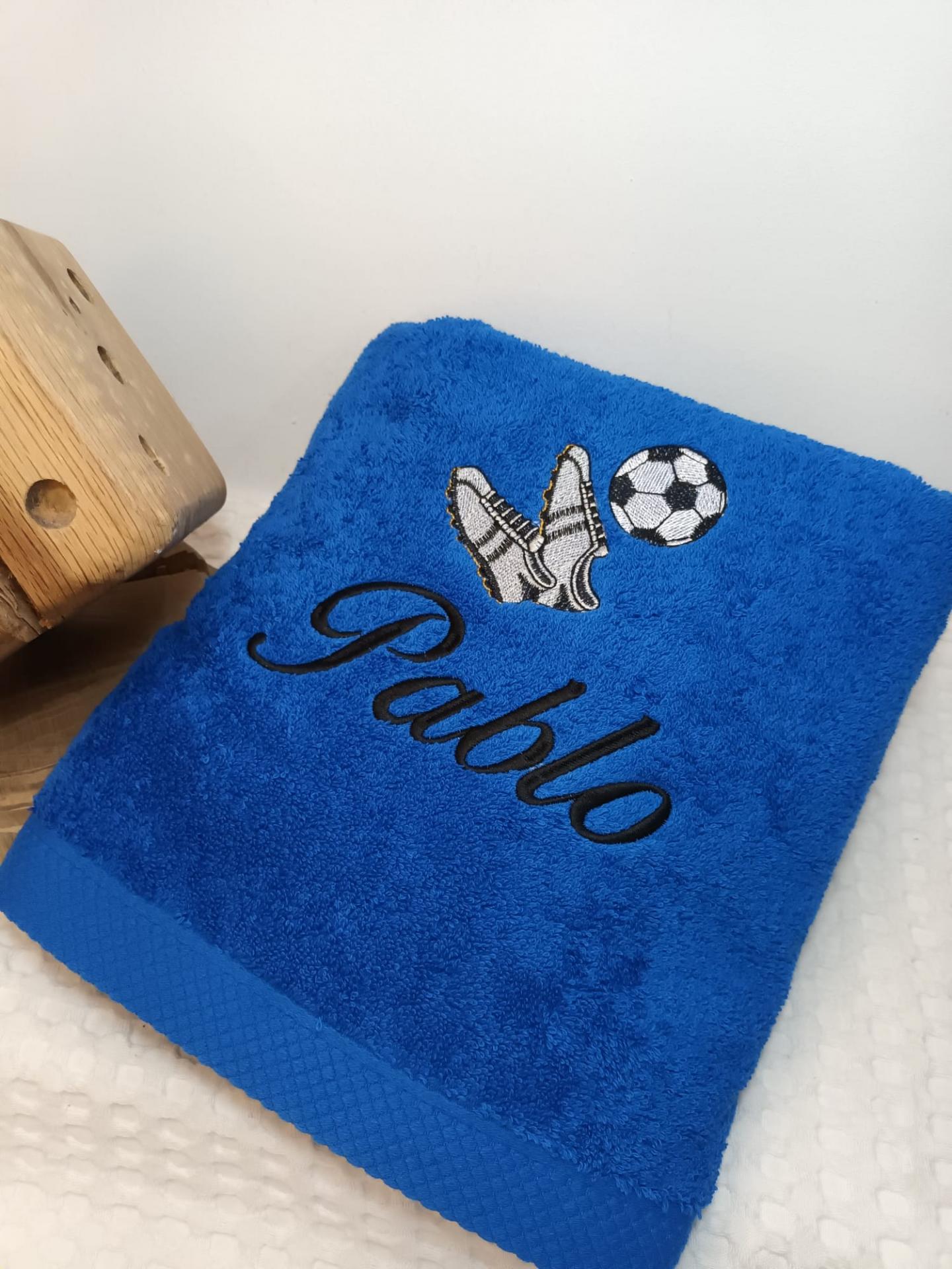 Toalla de ducha azulón con botas de Fútbol y el nombre bordado.