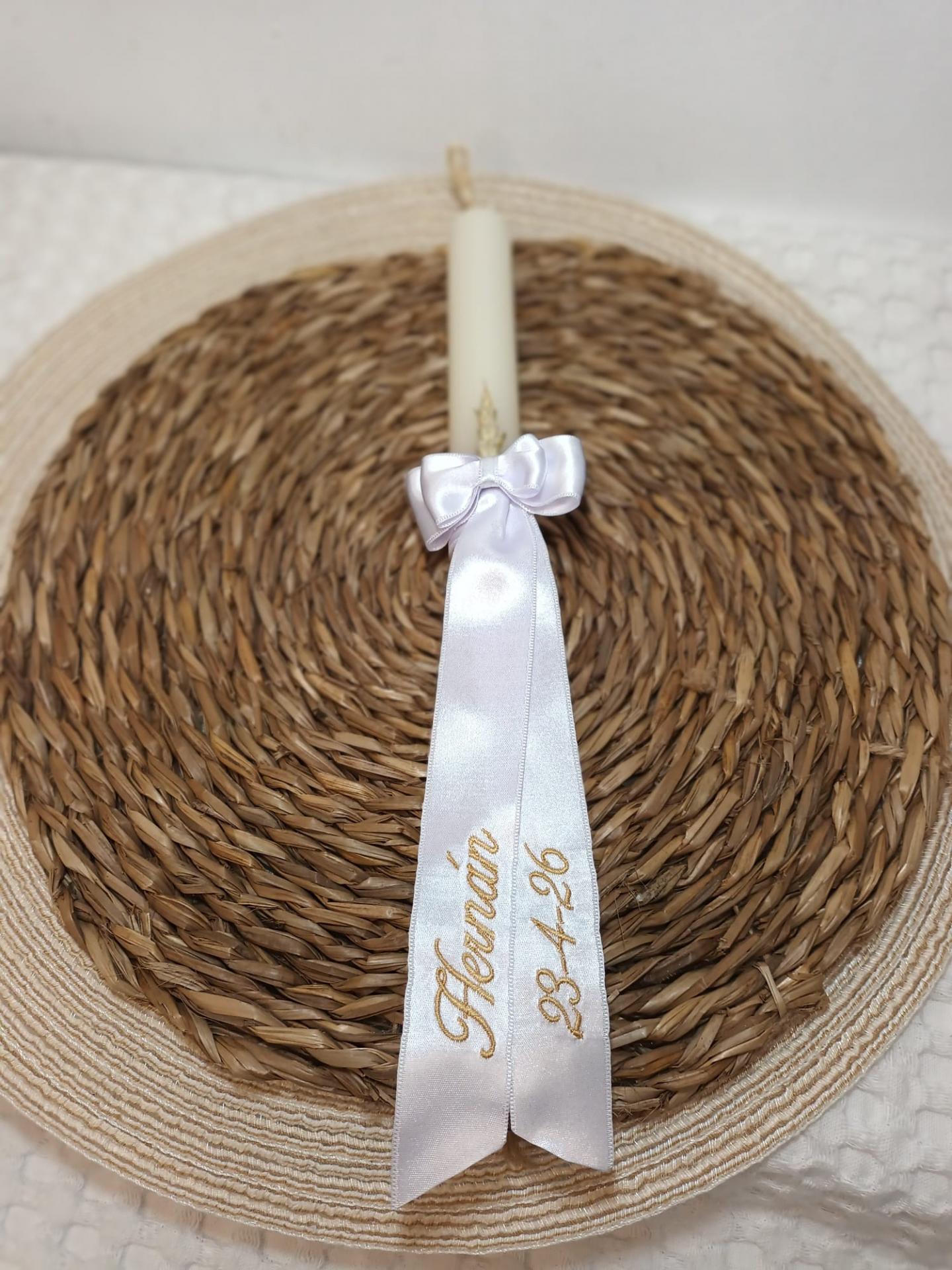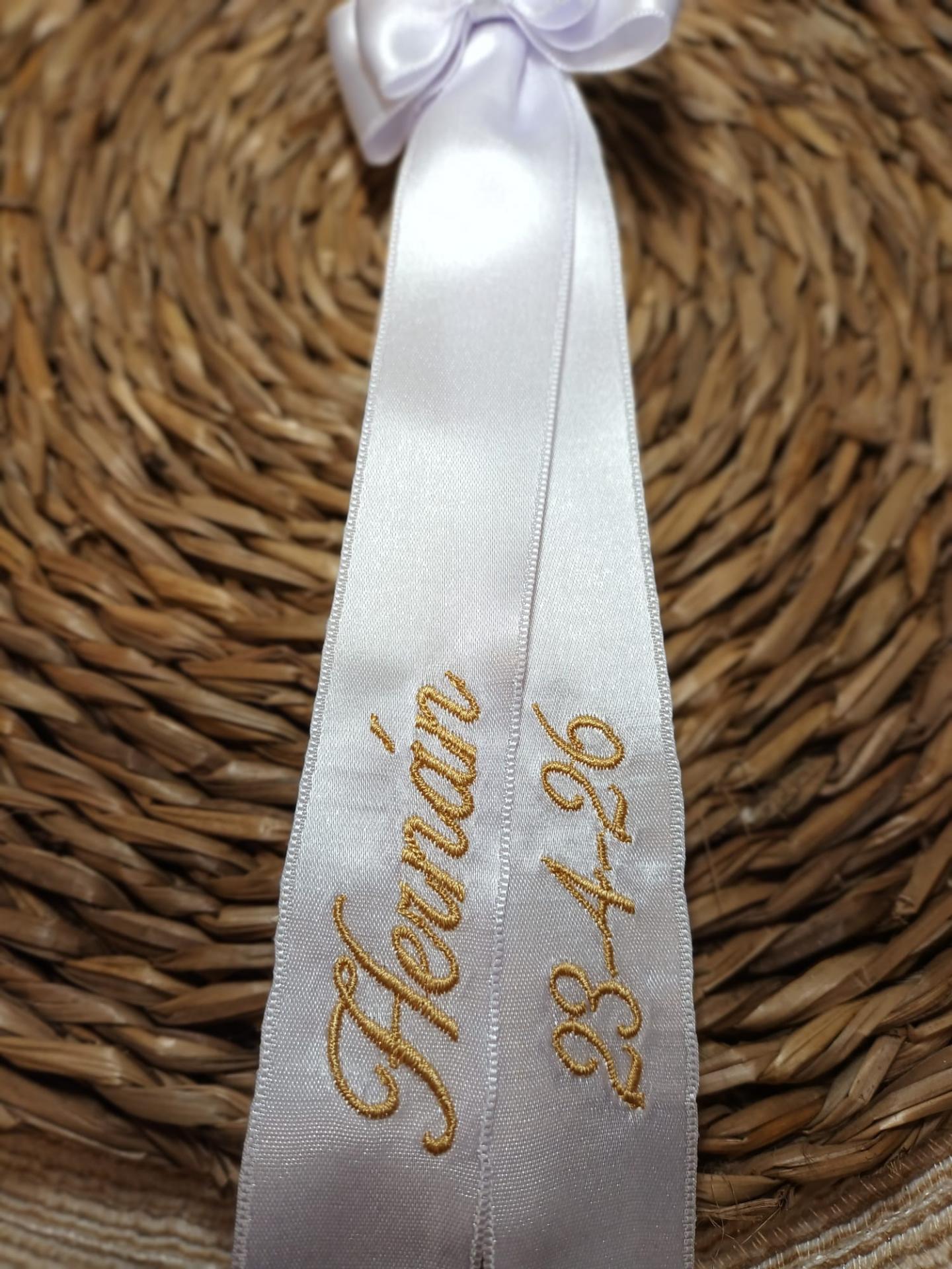 Con lazo de raso Blanco con el nombre y la fecha del Bautizo bordados en dorado.