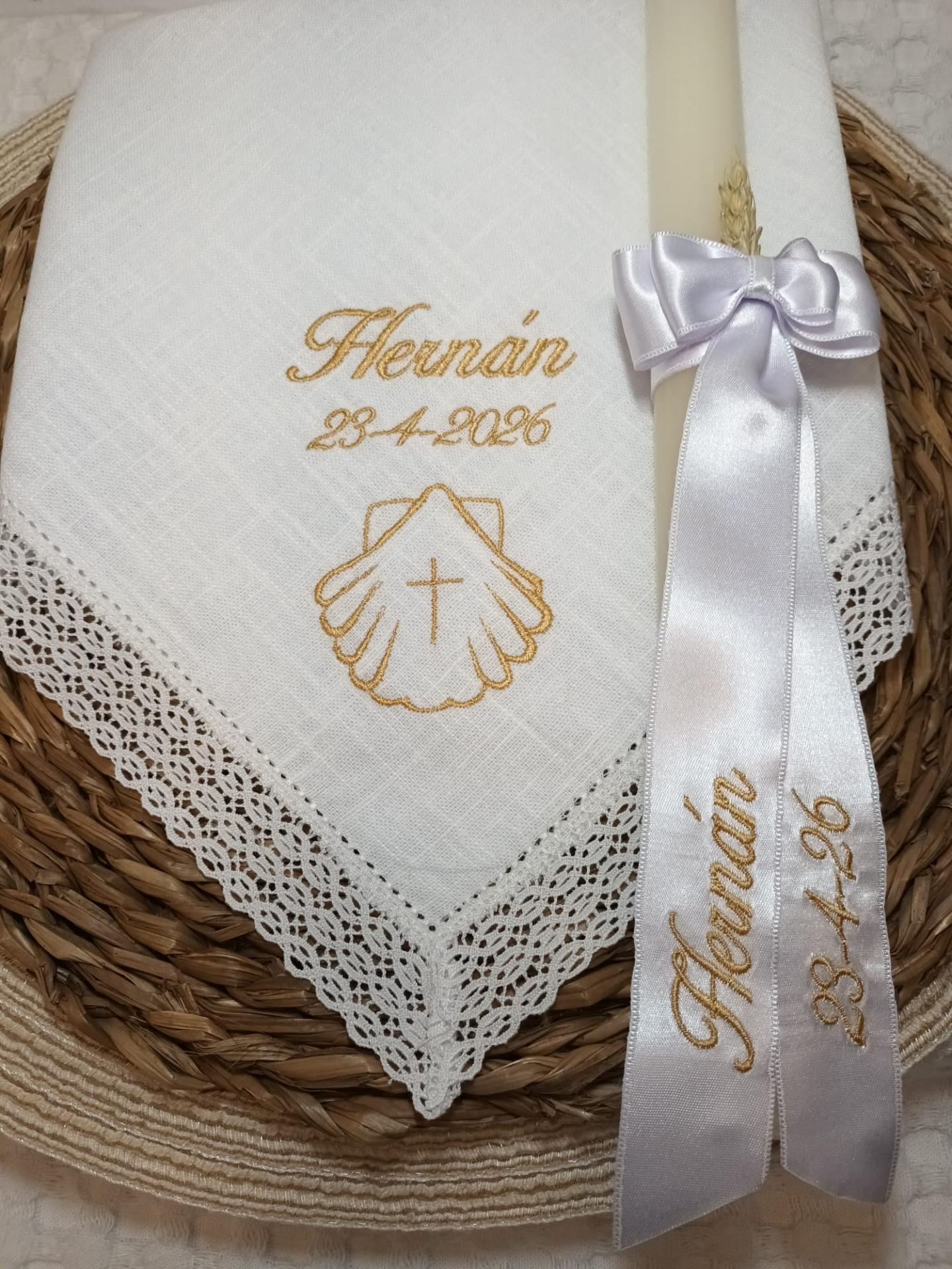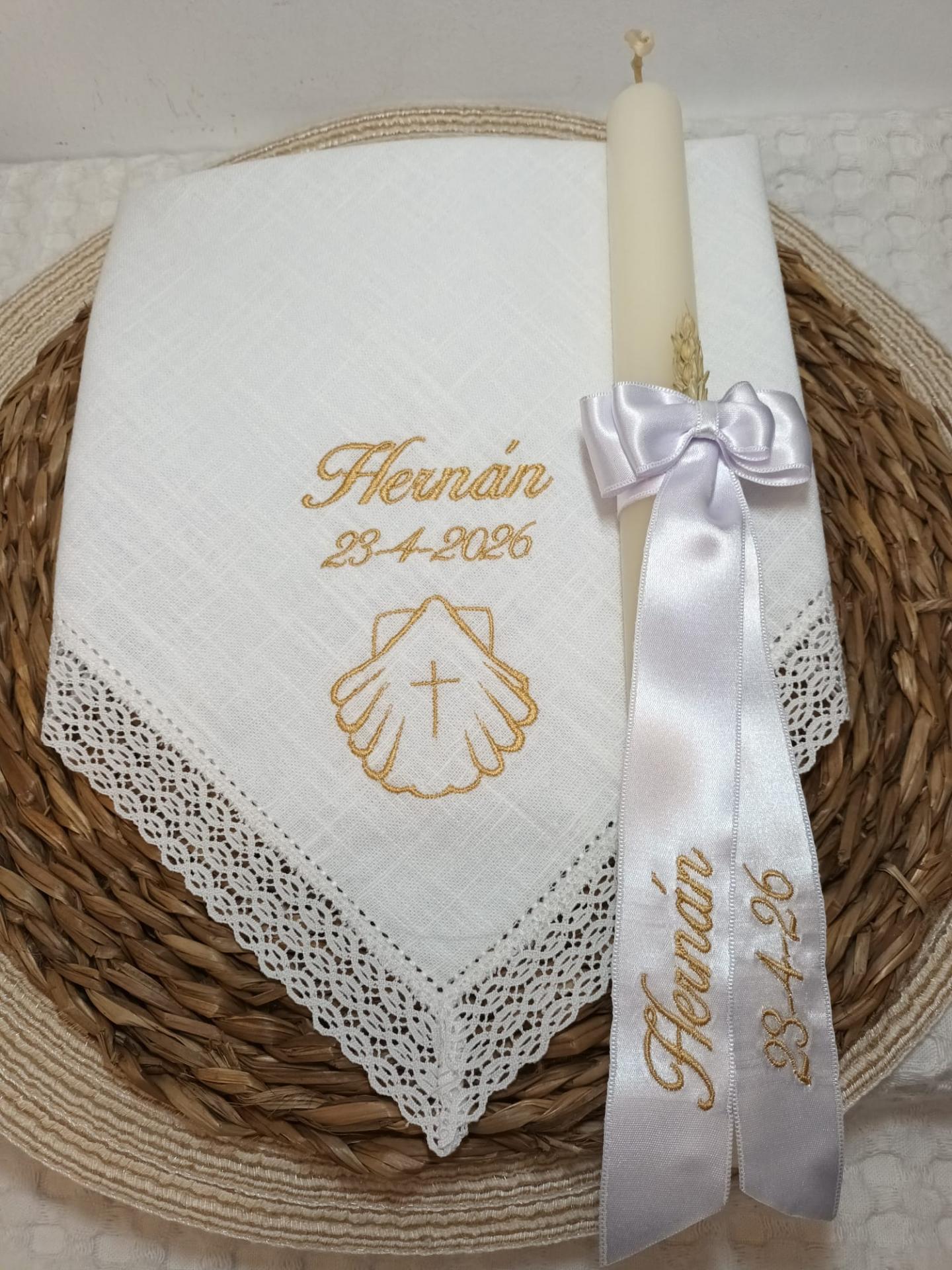 Con lazo de faya bordado el nombre y la fecha del Bautizo en azul empolvado.