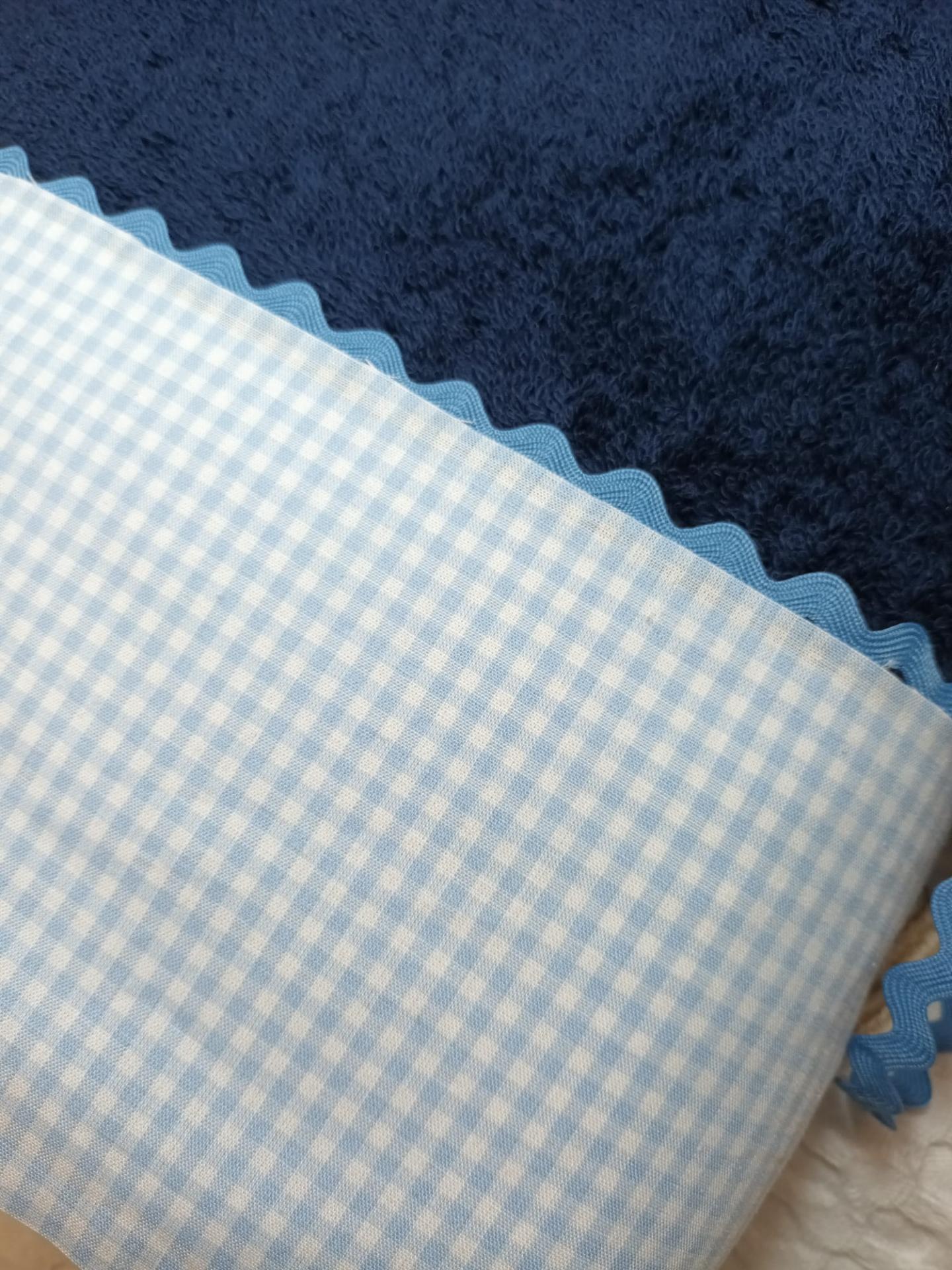 Toalla personaliza con cenefa de vichy celeste, con piquillo azul jeans.