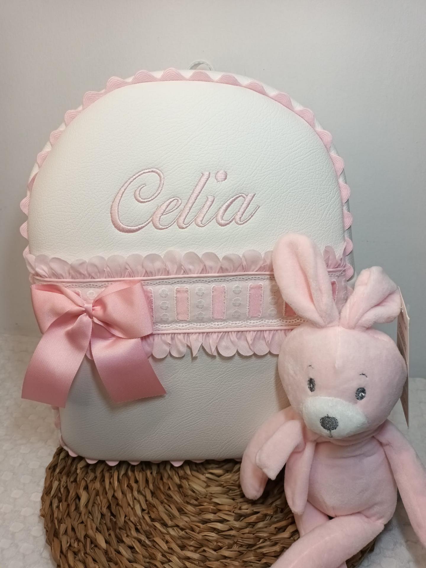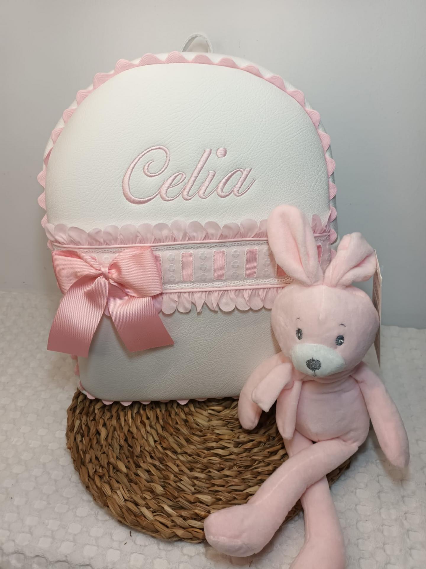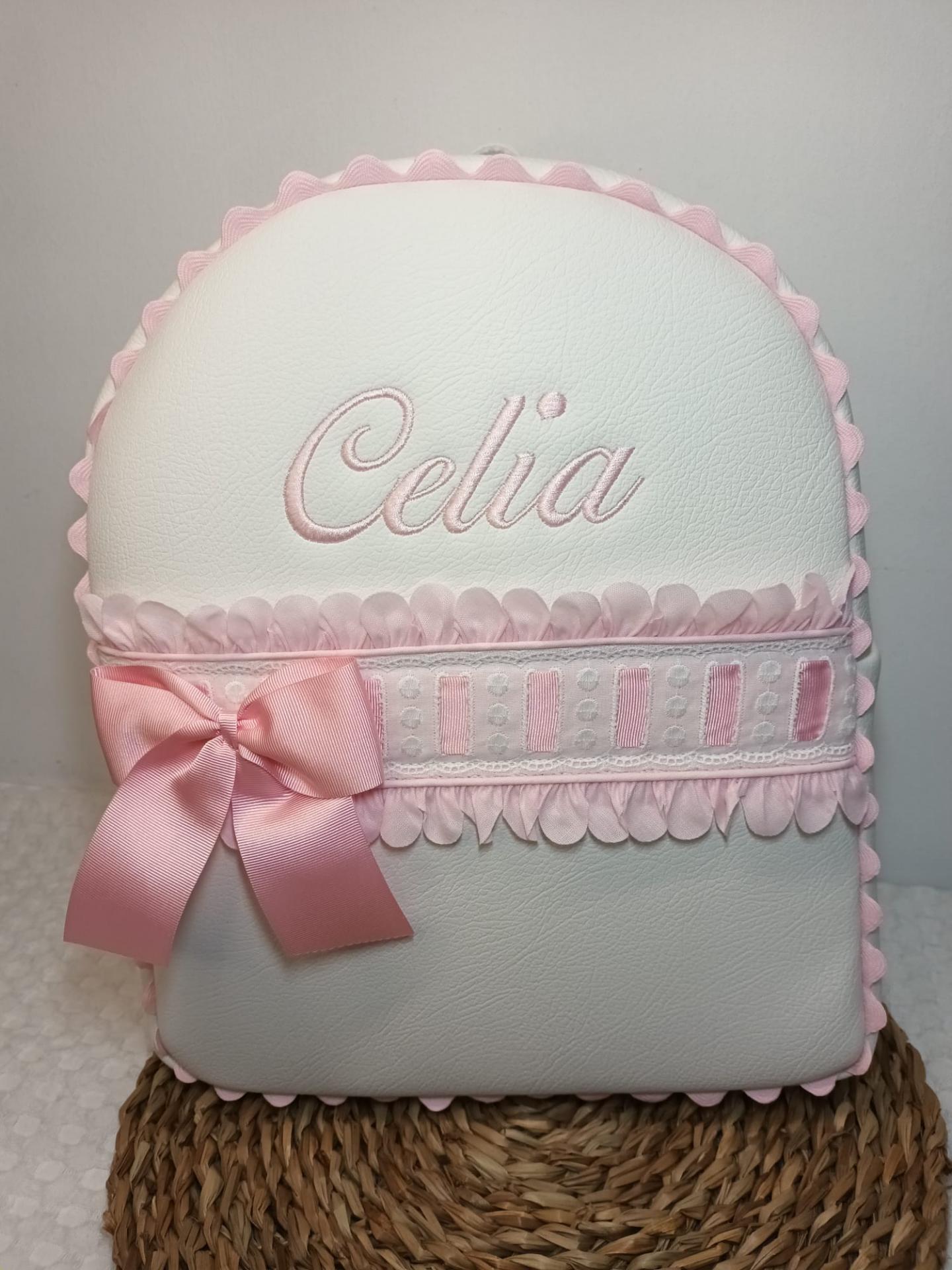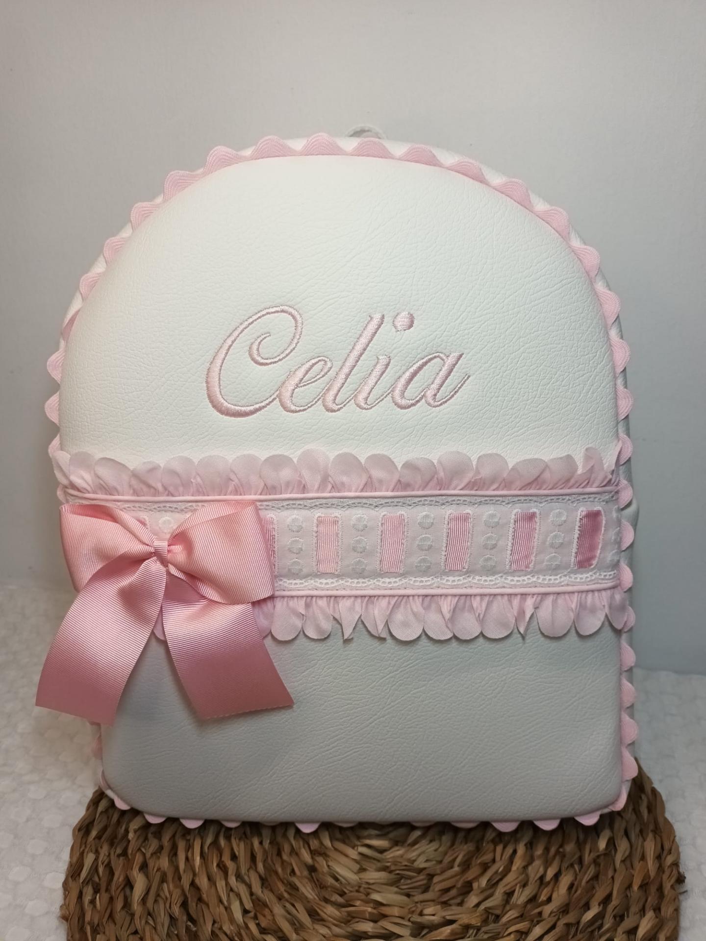 Mochila de polipiel crudo con pétalos lazo y bordado en rosa.