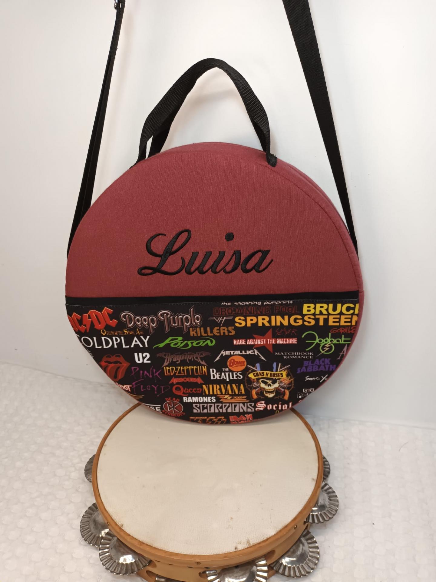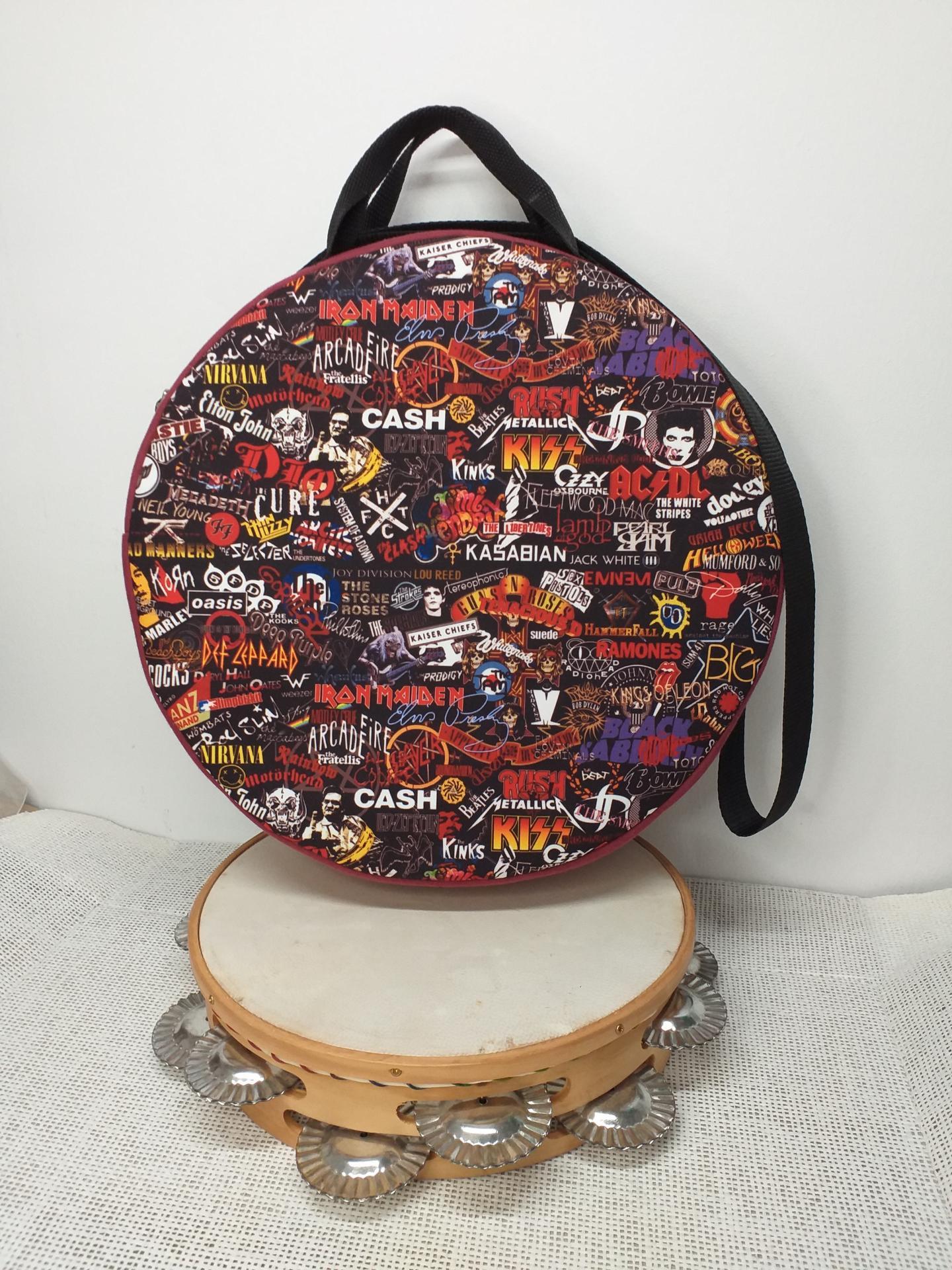 Funda Pandereta granate personalizada con tela de Bandas de Rock.